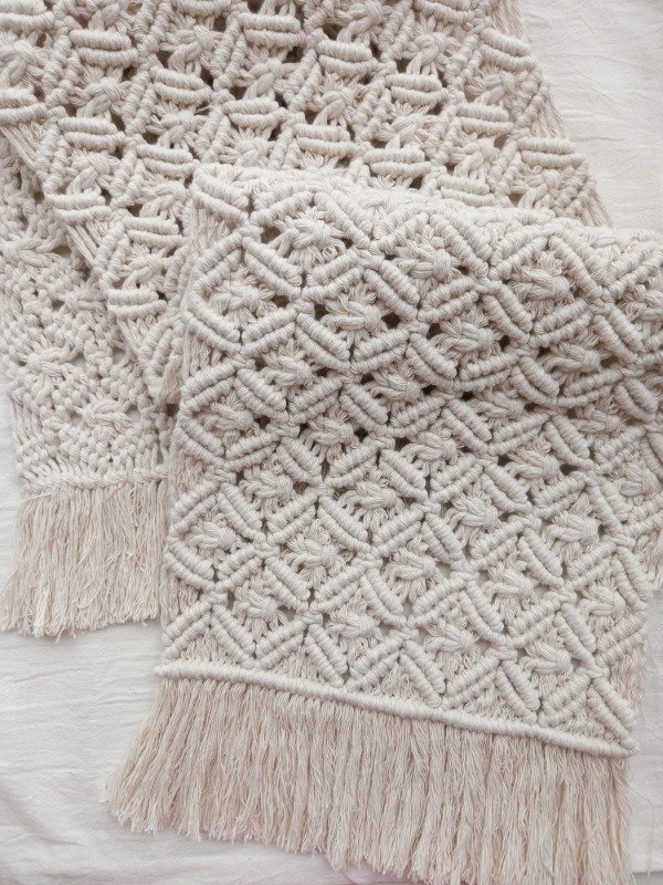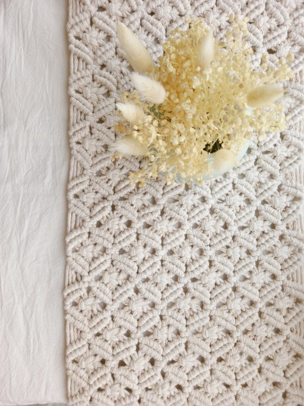 Es una pieza artesanal que combina elegancia y calidez. Sus nudos entrelazados crean patrones únicos que añaden textura y un toque bohemio a la decoración.